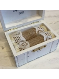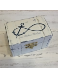 The boxes are painted in an antique white/cream color with an option of black, navy, aqua, blush (or any color) shabby accents to coordinate with your scheme. Your choice of design and wording are first digitally created before being are transferred by hand on to the lid using a translucent transfer medium, lots of patience and a delicate hand.