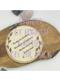 On the back of the ornament I use a thin wood round to give a neat, tidy finish. I am more than happy to burn wording: a quote, song lyrics, names, dates for you on it for no additional cost.
